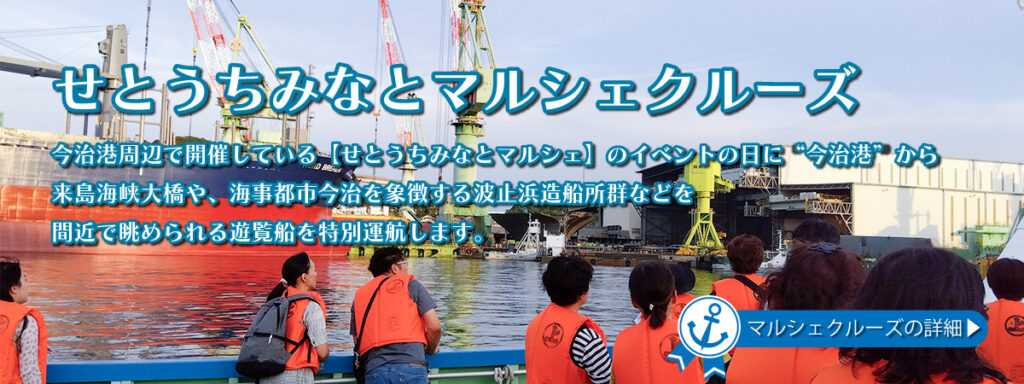 | How to make a reservation | ◆ For inquiries made up until the day before your trip, please contact Shimanami Co., Ltd. Sales Headquarters TEL: 0898-25-7338 FAX: Reception: Weekdays 9:00-17:00 (Closed: Saturdays, Sundays, and public holidays) ◆ For inquiries on the day of your trip or on weekends and public holidays, please contact Yoshiumi Ikiikikan Roadside Station (Boat Ticket Sales Office) TEL: 0897-84-3710 Reception: (Weekdays) 9:00-16:00, (Saturdays, Sundays, and public holidays) 9:00-17:00 ◆ For online reservations, please click here for the reservation form |
