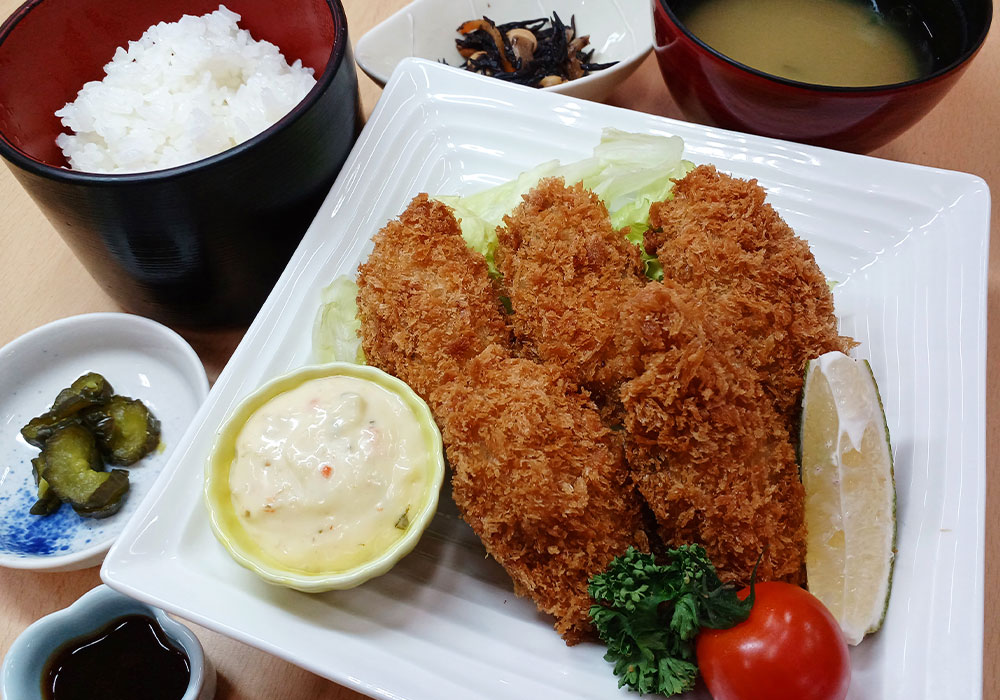 道の駅「よしうみいきいき館」のレストランでは、瀬戸内の新鮮な魚介類を使った料理が楽しめます。特に人気なのは海鮮丼で、サザエや季節の魚が盛られたボリュームたっぷりのメニューが用意されています。また、定食メニューも充実しており、鯛飯や天ぷら、煮付けなどがセットになった御膳が人気です。