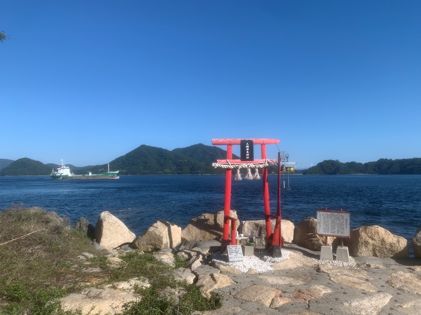 静かな野賀の砂浜を、中ノ鼻の突端方向に進んで行くと、赤い鳥居が見えてきます。大綿津見神社は、昭和12年に建立した石碑が、いつしか波間に消えていました。2021年(令和3年)波打ち際の岩の間から発見され、有志が修復し、新たに赤い鳥居を建立しました。風待ち、潮待ち港として、栄華を誇った木江。光がまばゆいほど、影もまた色濃く・・・海を背にしてその由来が記されています。赤い鳥居の向こうに広がる海の碧さ、空の青さ!このコントラストを背景に、悠々と横断していく船舶・・・心あらわれる祈りの空間です。