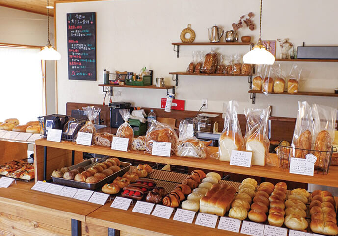 畑の恵み豊かな大三島へ、パン作りを通じての恩返し。みかん酵母、麹菌の天然培養酵母の生地、大三島の塩、旬の有機食材などを織りまぜて焼き上げた個性あふれるパンたちが、棚いっぱいに。大三島の島内はもちろん、伯方島、生口島のほか、開店時間をめざし、四国からしまなみ海道を走り抜けてくる常連客も。大三島の恵みを食べ尽したい方にオススメ!