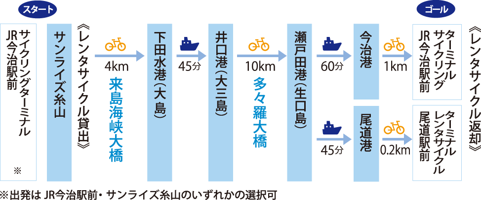 しまなみ海道の橋で人気が高い来島海峡大橋と多々羅大橋の2つの橋をサイクリングするコース。「サイクルシップ」では来島海峡大橋・大三島橋・多々羅大橋の3つの橋をくぐる贅沢プランです。
