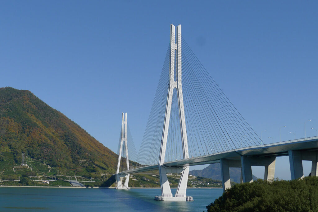 瀬戸内海の穏やかな多々羅海峡に架かる、広島県生口島と愛媛県大三島を結ぶ橋です。優美な白鳥が羽を広げたような姿が特徴的な斜張橋で、完成時には中央支間長890mで世界最長を誇りました。この卓越した技術力は、当時世界第2位だったフランスのノルマンディー橋と姉妹橋提携を結ぶに至りました。その優雅で洗練された機能美は、「しまなみ海道で一番美しい橋」と称されることもあります。また、橋の主塔の下では、手を叩くと音が天空に響き渡る「鳴き龍」現象を体験でき、サイクリストをはじめ多くの訪問者に親しまれています。