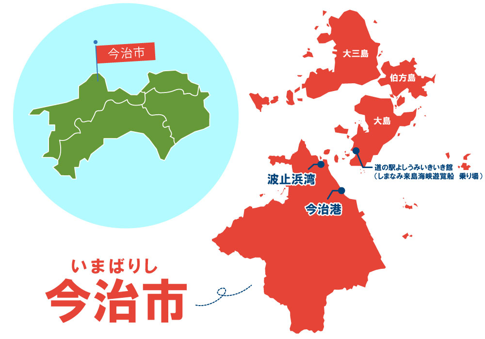今治市は、四国・愛媛県の北東部、瀬戸内海のほぼ中央に位置するまちです。