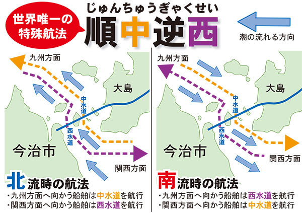世界的に船舶は右側通航が基本ですが、来島海峡では「順中逆西航法」と呼ばれる特別な航行ルールが定められています。