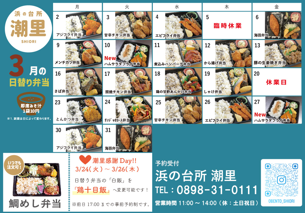 | 営業時間 | 11:00~13:00 ※売切れ次第終了 ※季節により変更あり |