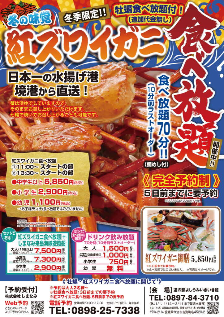 【よしうみいきいき館】牡蠣・紅ズワイガニ 開催期間延長のお知らせ 2026 3/17 info 道の駅 よしうみいきいき館 BBQ しまなみ来島海峡遊覧船 イベント 期間限定 2026年3月17日 【冬季限定】牡蠣食べ放題・牡蠣御膳紅ズワイガニ食べ放題・紅ズワイガニ御膳 2025年12/1(月)~2026年3/22(日)まで→好評につき3/31(火)まで期間延長! 詳細・ご予約はこちらから。 info 道の駅 よしうみいきいき館 BBQ しまなみ来島海峡遊覧船 イベント 期間限定 よかったらシェアしてね! URLをコピーしました! 来島海峡大橋塔頂体験 2026年4月~6月受付開始