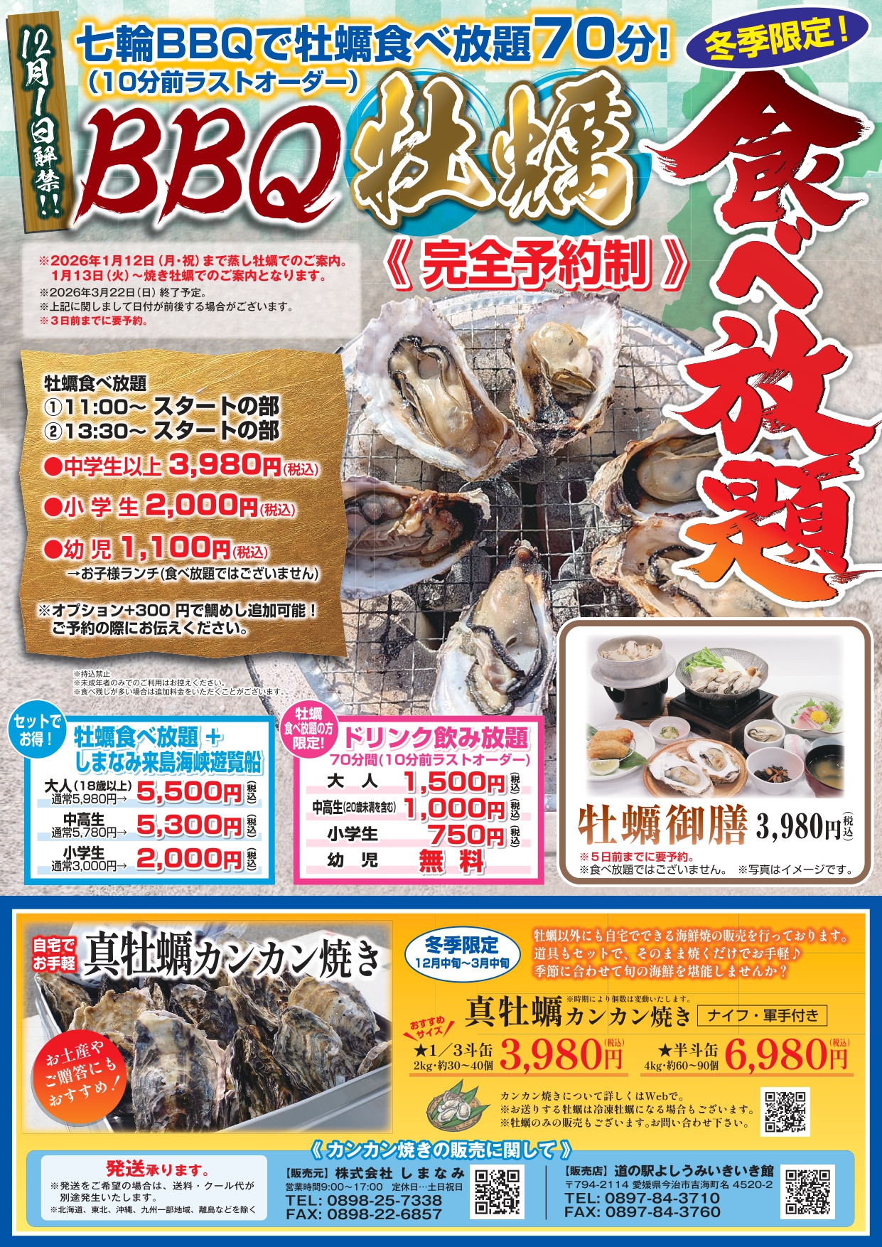 - 牡蠣は焼き(蒸し)牡蠣専用です。生では食べられません。
