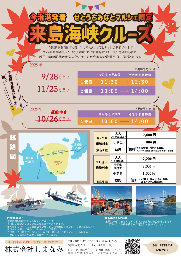 予約 | オンライン予約は3日前まで。 予約をしていなくても当日空席がありましたらご乗船可能です。 ※定員数に達した場合、事前予約や当日ご乗船は出来ません。 ※キャンセル料… 利用日の3日前から20%/当日は100%発生いたします。 株式会社しまなみ 予約受付本部 “Web 予約“またはTEL:0898-25-7338から 営業時間9:00~17:00 定休日…土・日・祝日 |