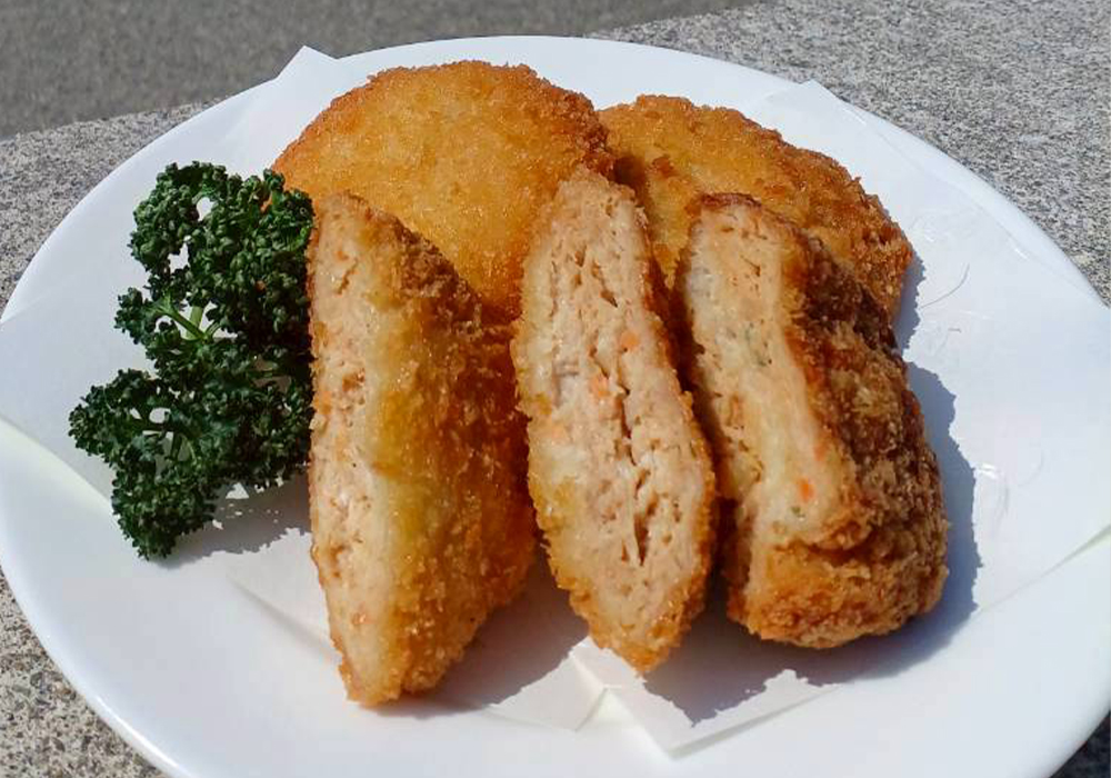 愛媛県今治市・大島産のレモン果汁&皮と、国産地鶏を使用したメンチカツです。